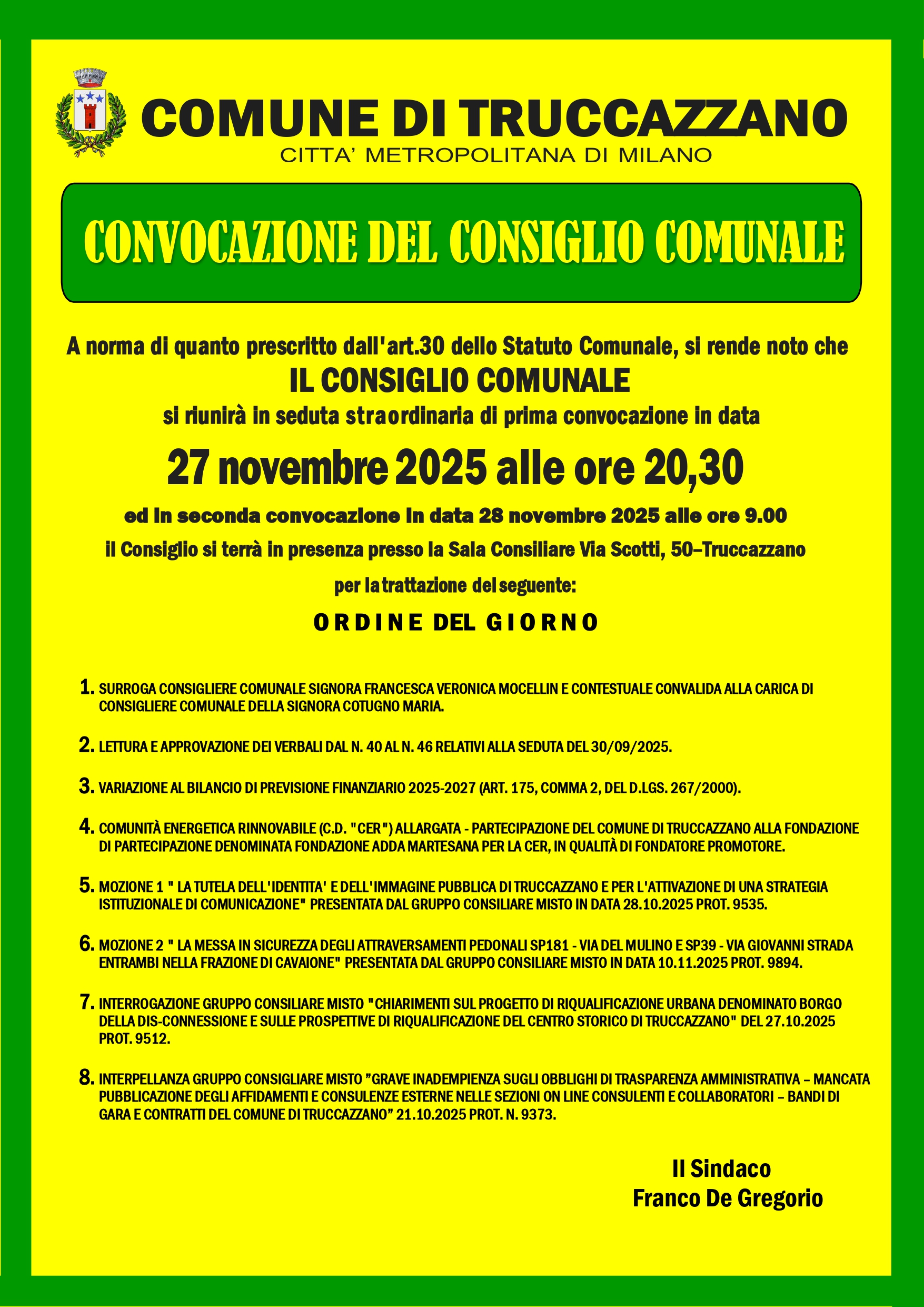 CONVOCAZIONE CONSIGLIO COMUNALE DEL 27 NOVEMBRE 2025 ORE 20.30