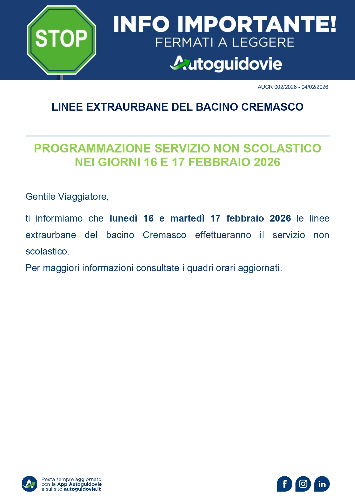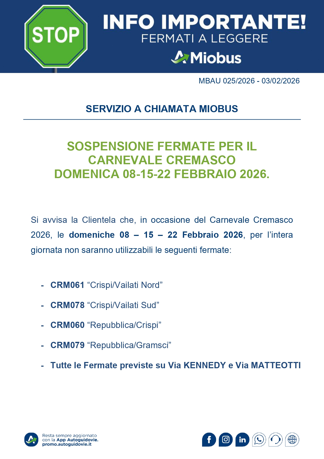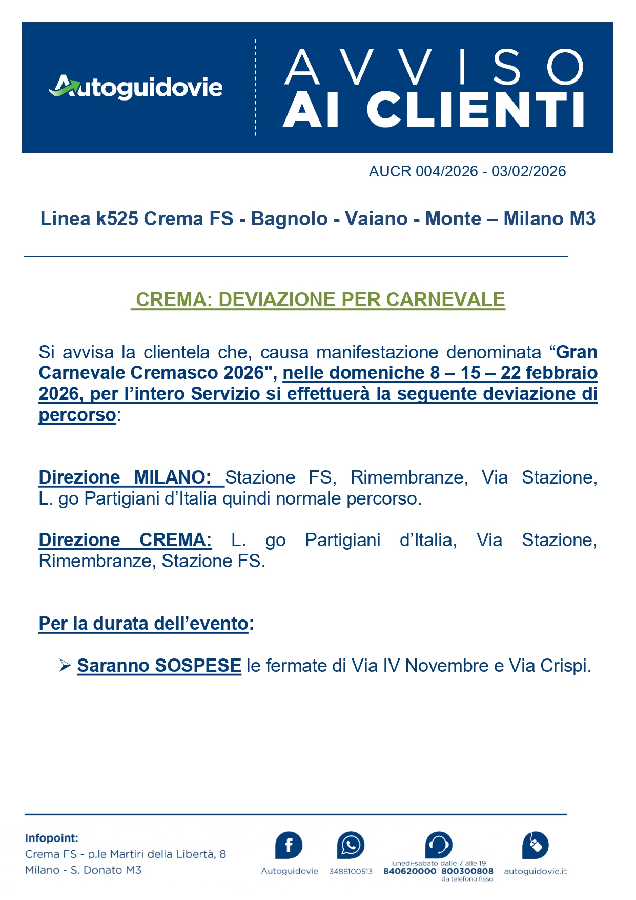 AVVISI PER CARNEVALE 2026 DA AUTOGUIDOVIE 10 Febbraio 2026 Condividi sui Social! Facebook Twitter LinkedIn