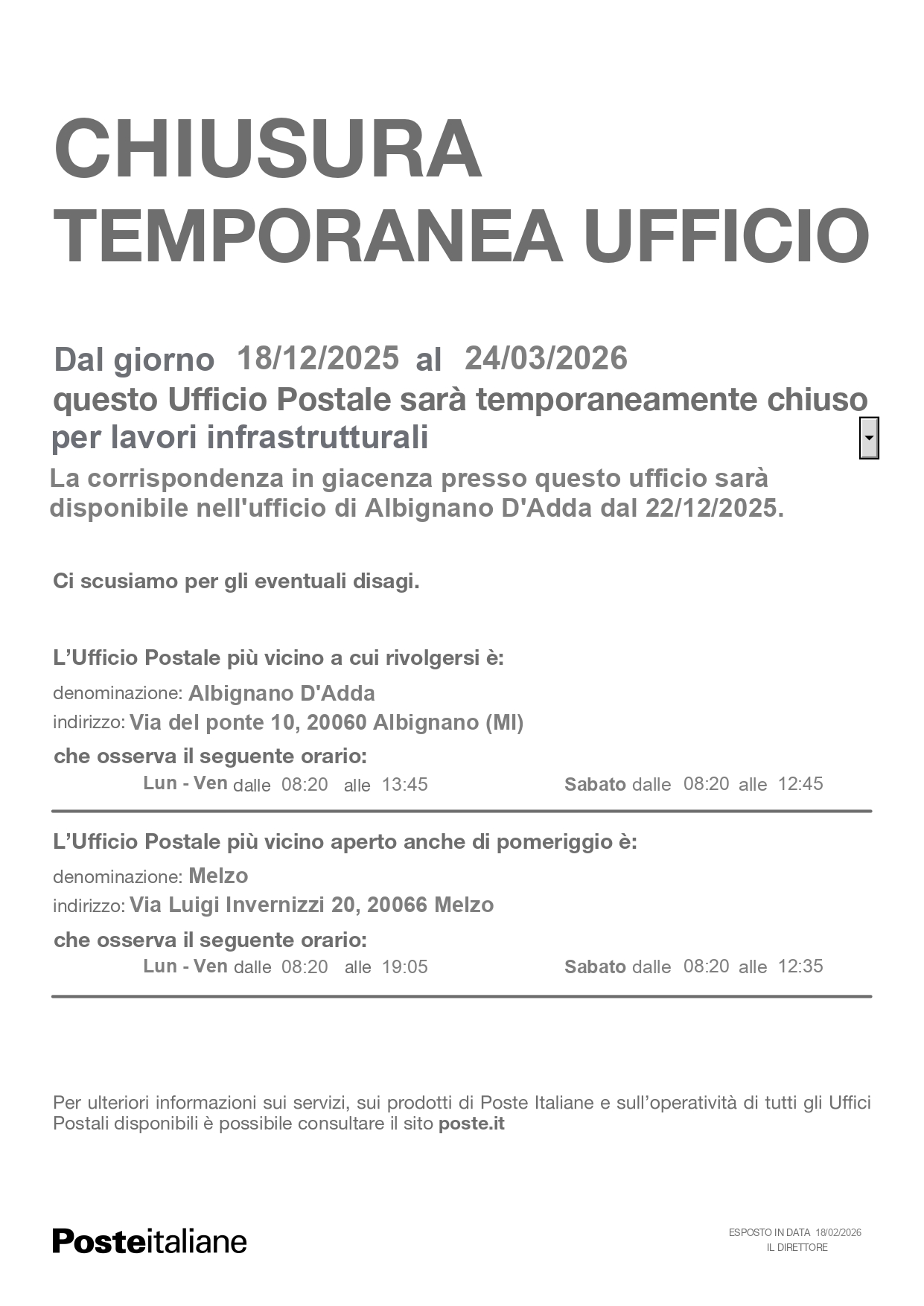 CHIUSURA TEMPORANEA UFFICIO POSTALE DI TRUCCAZZANO 18 Febbraio 2026 Condividi sui Social! Facebook Twitter LinkedIn